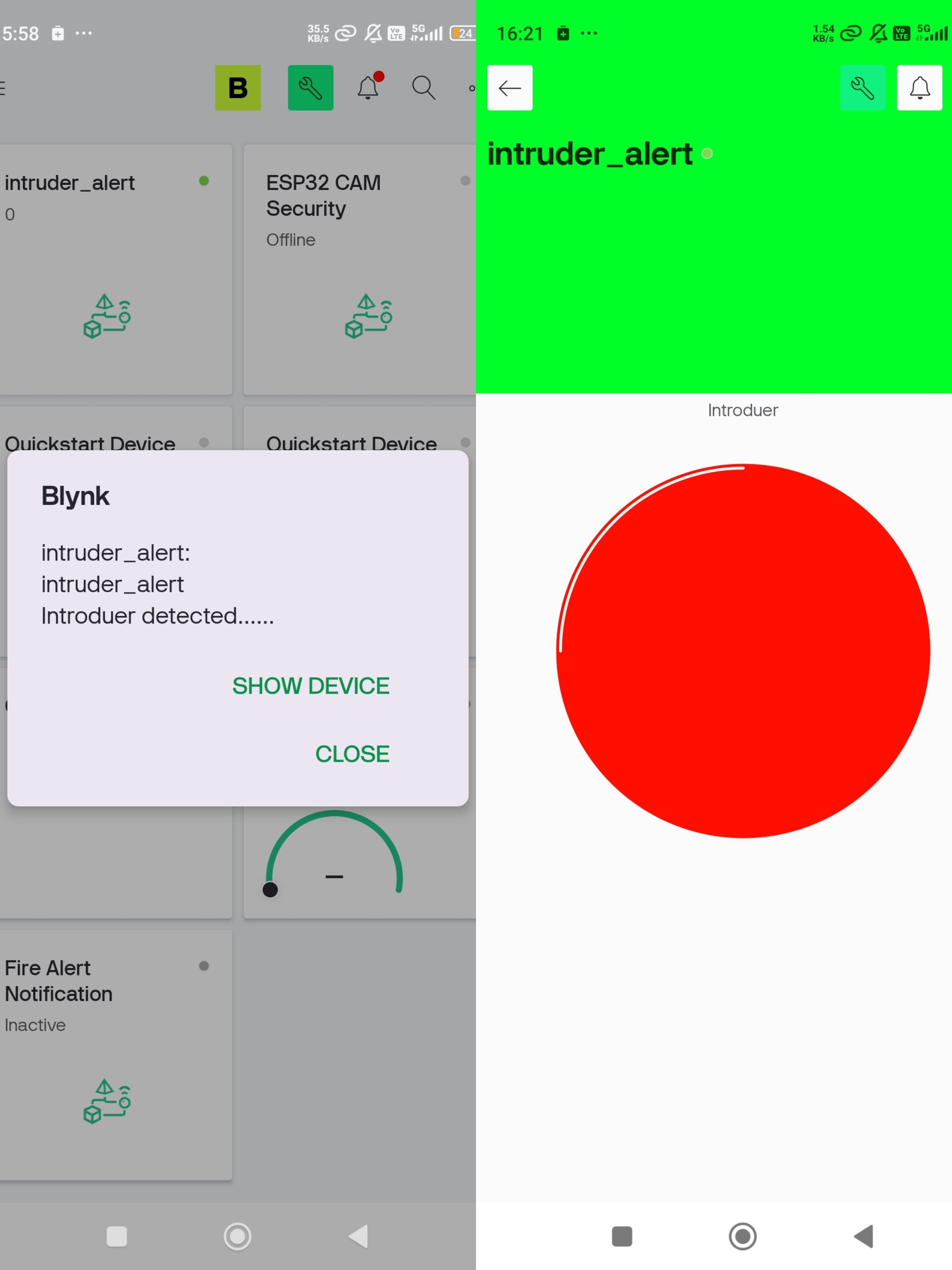 The system uses two smartphones for better security. One smartphone receives intrusion alerts from the ESP32 through the Blynk app. The second smartphone is used as an IP camera to provide live video monitoring after an alert is received.