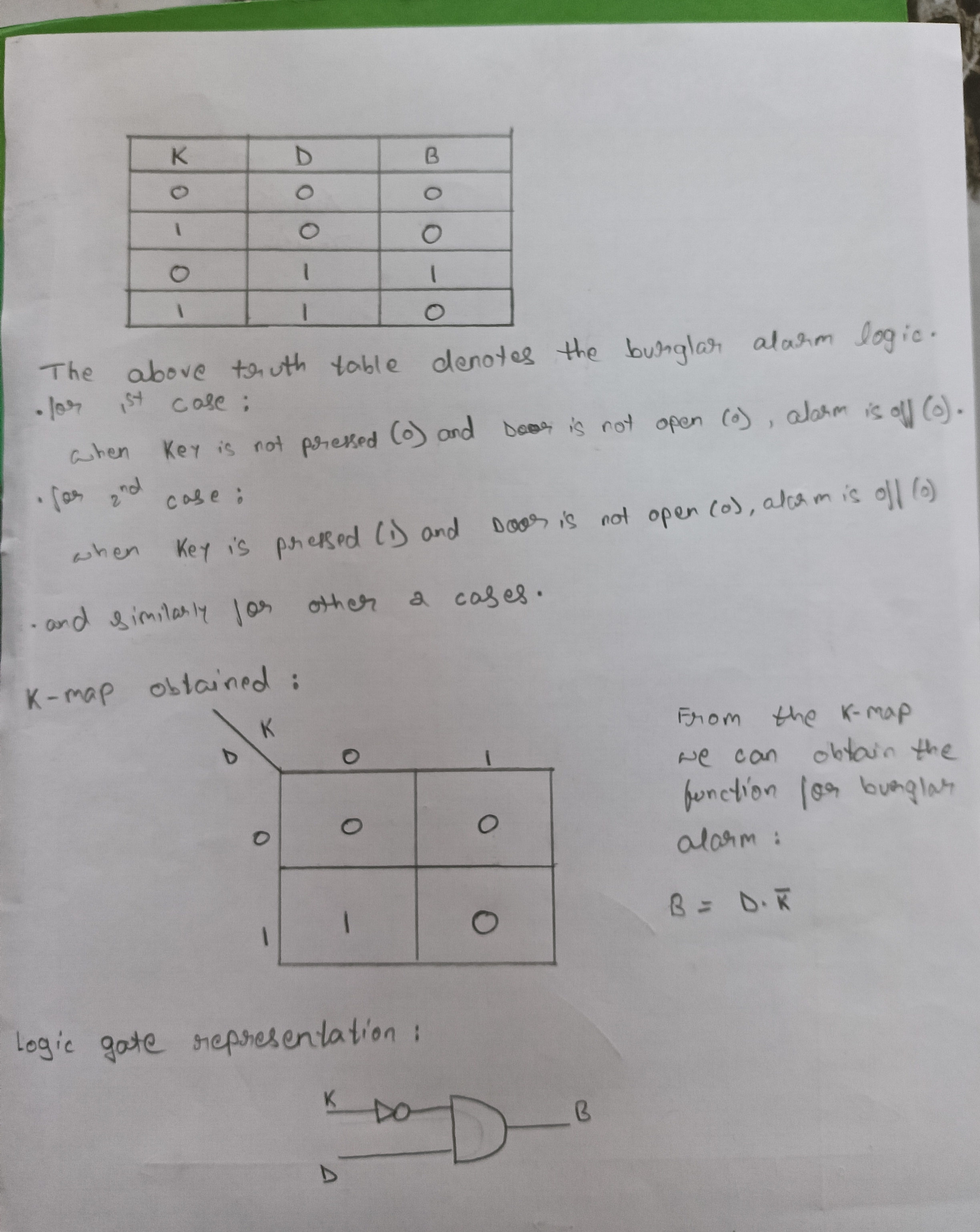 Objective:Determine the karnaugh map and make a burglar alarm using simple logic circuits. The buzzer or led blinks when certain conditions are met, you can use push buttons for the door and key.