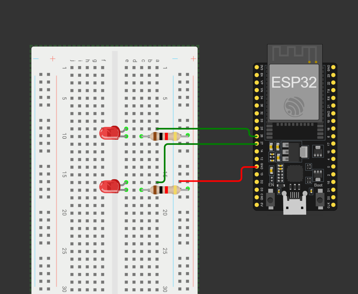 NOTE:LEDs require resistors to prevent excessive current flow, which can damage the LED or ESP32. A 330Ω resistor is suitable for most standard LEDs when using the ESP32’s 3.3V GPIO pins.