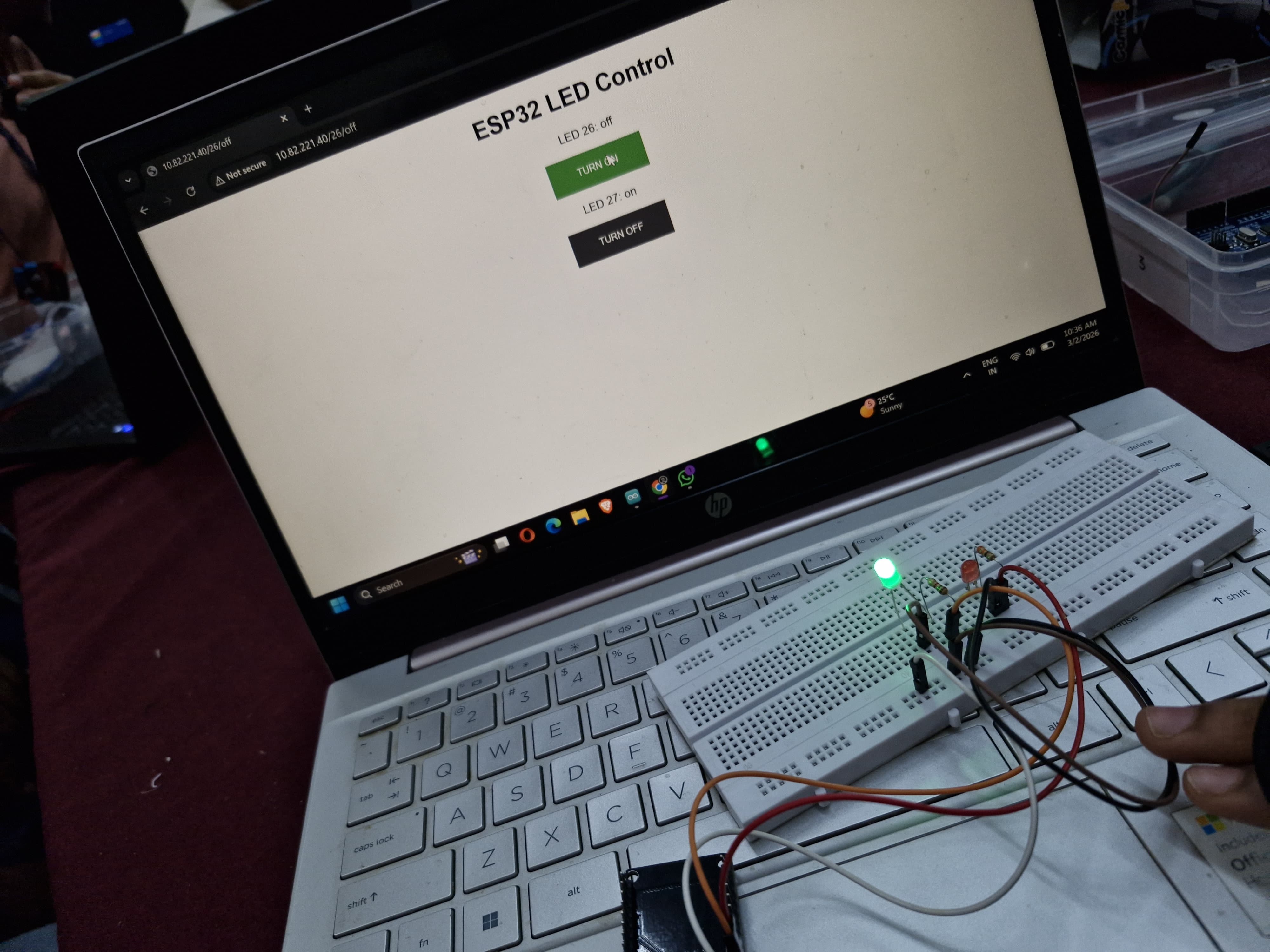 NOTE:Baud rate is the number of symbols (signal changes) transmitted per second in a communication channel, measured in Baud (Bd) or symbols per second. Enter this IP into any browser on a device connected to the same Wi-Fi. You’ll see a webpage with two buttons to control the LEDs.