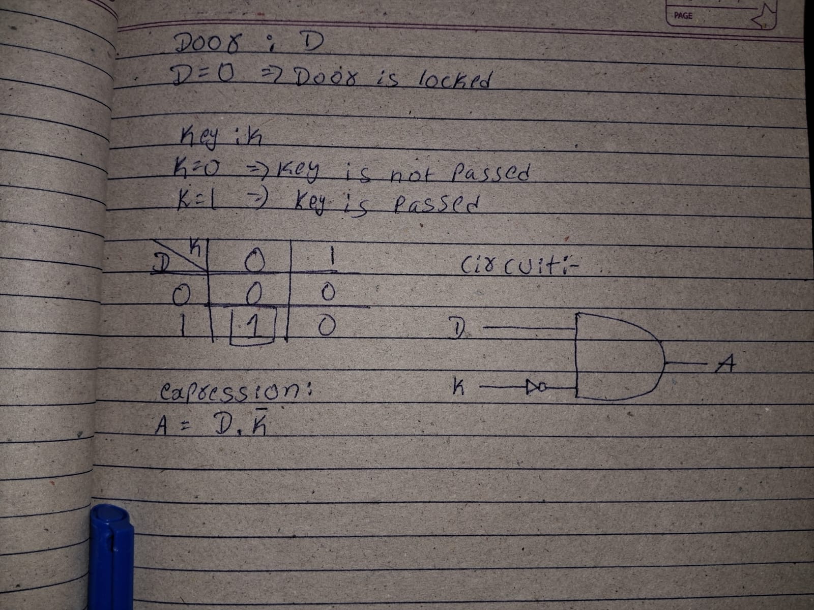 This task involved designing a simple burglar alarm using 2 input variables: door status and key press. Using Karnaugh Map, I derived the logic such that the alarm buzzes when the door is open and the key is not pressed. The logic circuit was also simulated in Tinkercad, helping reinforce Boolean simplification and basic digital logic implementation.