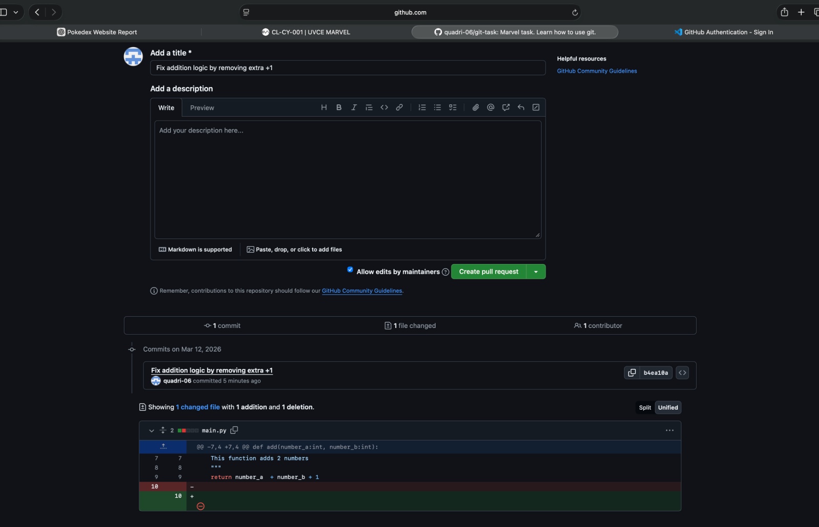 In this task, I familiarised myself with the GitHub workflow by forking, committing and creating a pull request. The task was to fix an addition error in a Python code which was causing it to fail test cases. This was executed by cloning the given repository, editing the segment causing the error and finally, submitting the changes via the pull request.