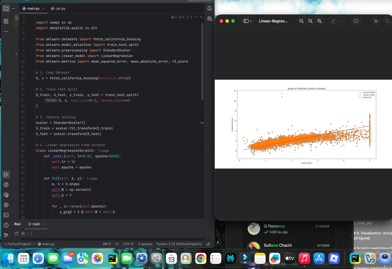 The scratch model computed predictions, gradients and updated weights iteratively. Its performance was evaluated using MSE, MAE and R² score, and compared with the sklearn model.