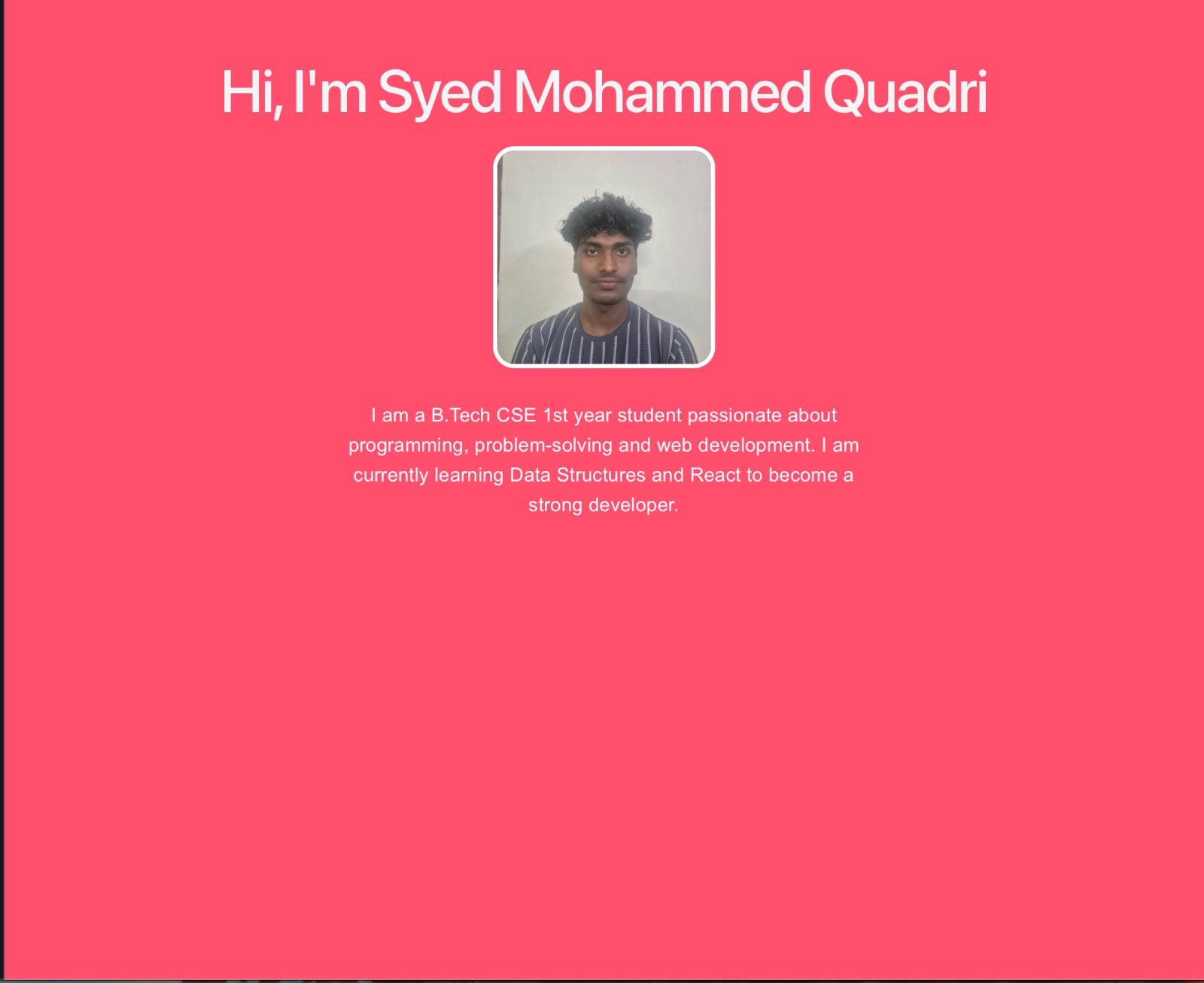 The Personal Portfolio Website is a responsive web application developed to showcase my academic background, technical skills, and projects. The main objective of this project is to create a professional online presence that represents my journey as a B.Tech Computer Science Engineering (1st Year) student.