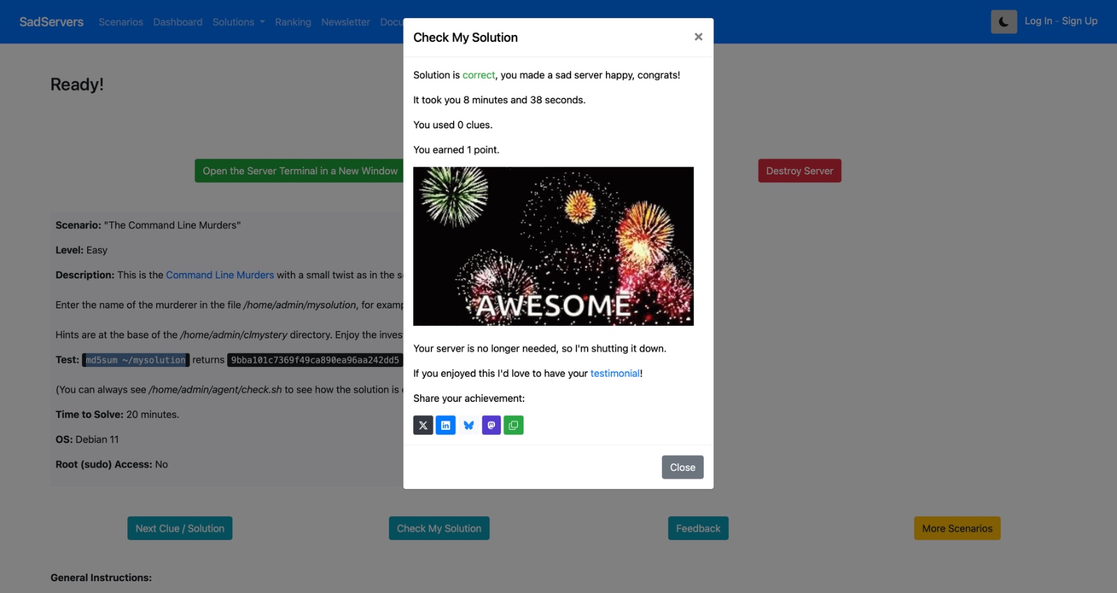 his task involved completing the Command Line Murders scenario on SadServers, where Linux command-line tools were used to investigate structured files and identify the correct solution. Commands such as grep, cat, sort, uniq, awk and md5sum were used to extract relevant information, filter suspects based on given clues and verify the final result using checksum validation. Through this task, I gained practical experience in Linux file navigation, text processing and logical debugging, improving my ability to troubleshoot problems in a command-line environment.
