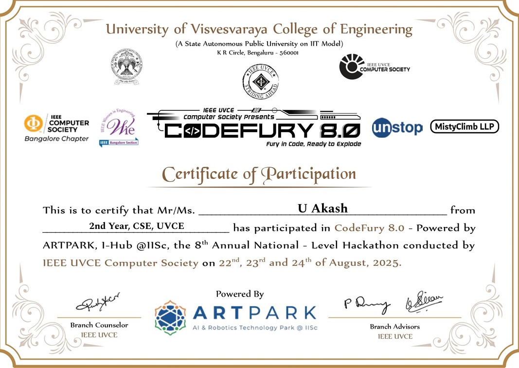 organized by different technical societies at UVCE. These events helped me improve my problem-solving skills, teamwork and exposure to real-world technical