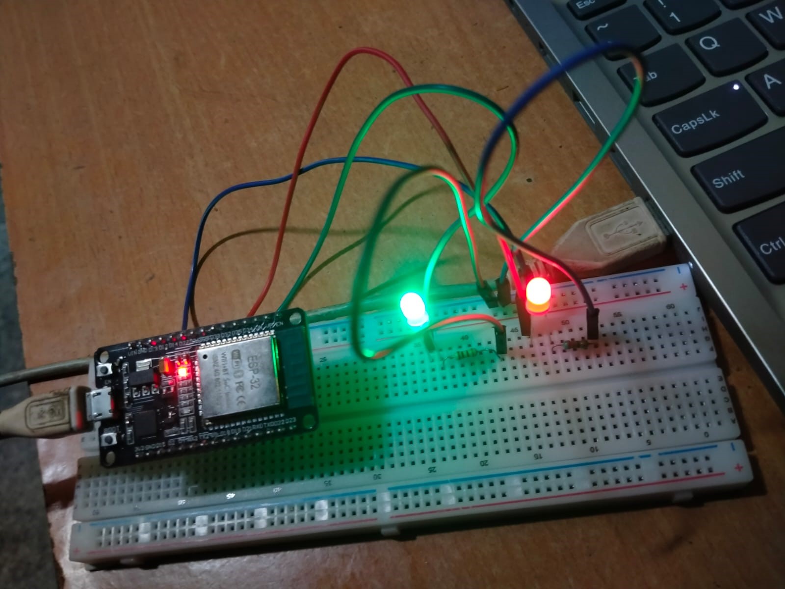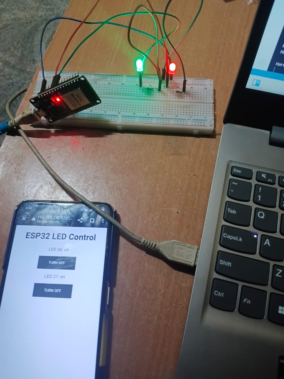 In this task I controlled LEDs using an ESP32 microcontroller through a web interface. The ESP32 was connected to two LEDs on a breadboard using resistors. After connecting the ESP32 to a WiFi network a simple web server was created that allowed the LEDs to be turned ON or OFF from a mobile phone browser. When the user presses the button on the webpage the ESP32 receives the request and toggles the LED state accordingly. This task helped me understand ESP32 WiFi capabilities IoT-based device control, and web server communication with hardware.