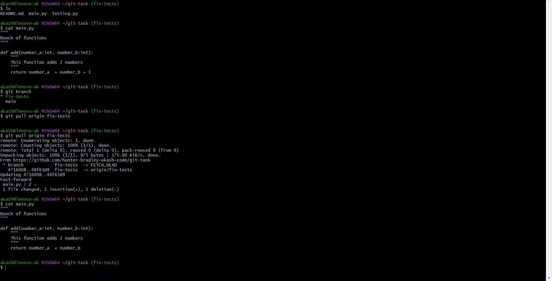 In this task I learned how to use Git and GitHub to fix an issue in a repository and contribute through a pull request. The repository contained a Python file (main.py) with a function that adds two numbers which had an error. I edited the file and corrected the code so that it properly returns the sum of the two numbers.