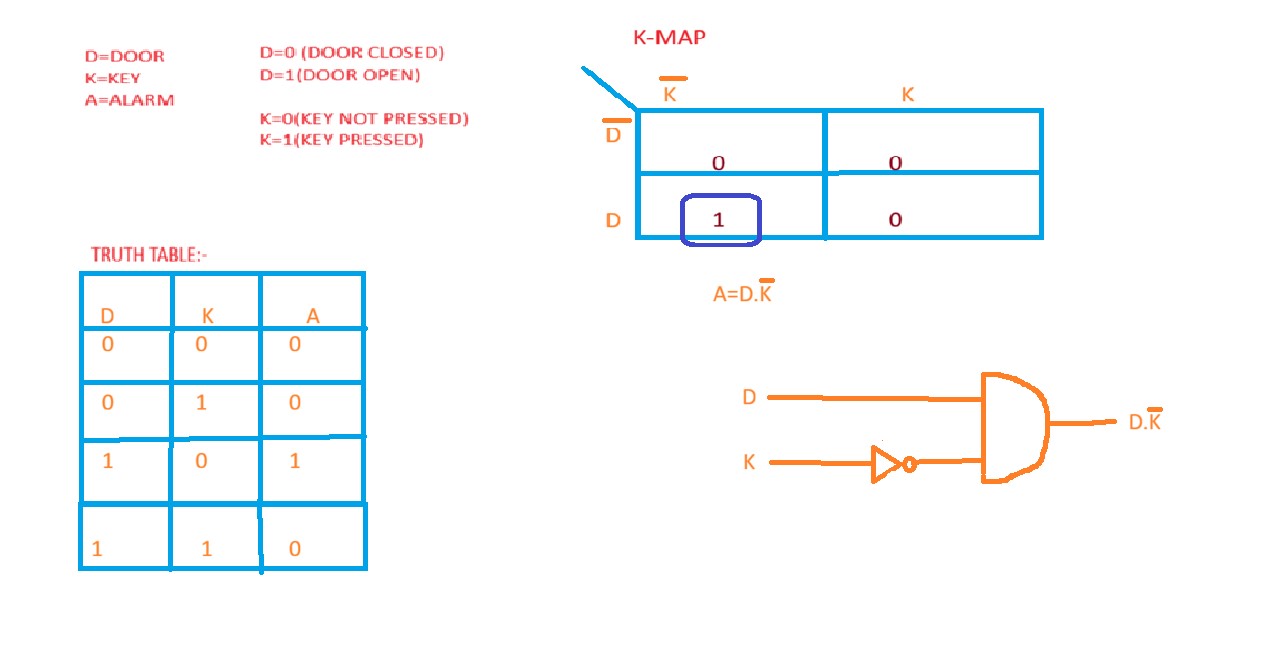 In this task I learned how to simplify Boolean expressions using Karnaugh Maps (K-Maps). A truth table was first created using the variables D (Door), K (Key) and A (Alarm). Based on the truth table a Karnaugh Map was drawn to simplify the Boolean expression. The simplified expression obtained was A = D · K̅. Using this expression the corresponding logic circuit was designed using a NOT gate for K and an AND gate with input D and K̅ to generate the alarm output. This task helped me understand logic simplification and how to implement the simplified expression using digital logic gates.