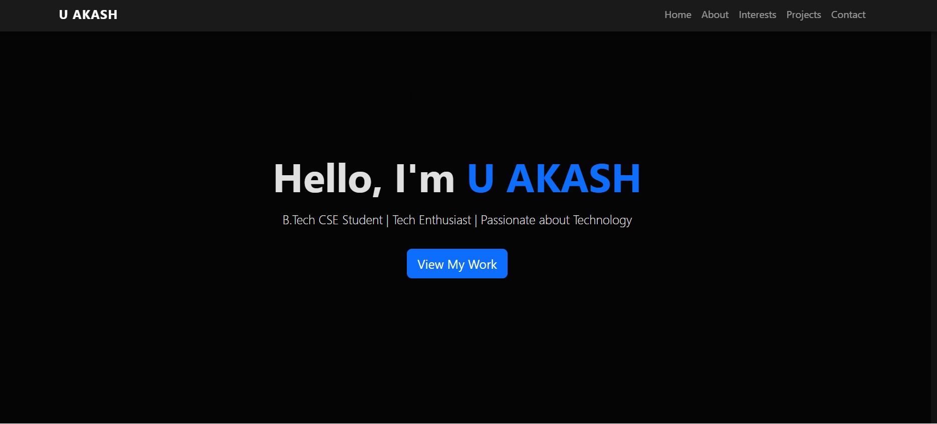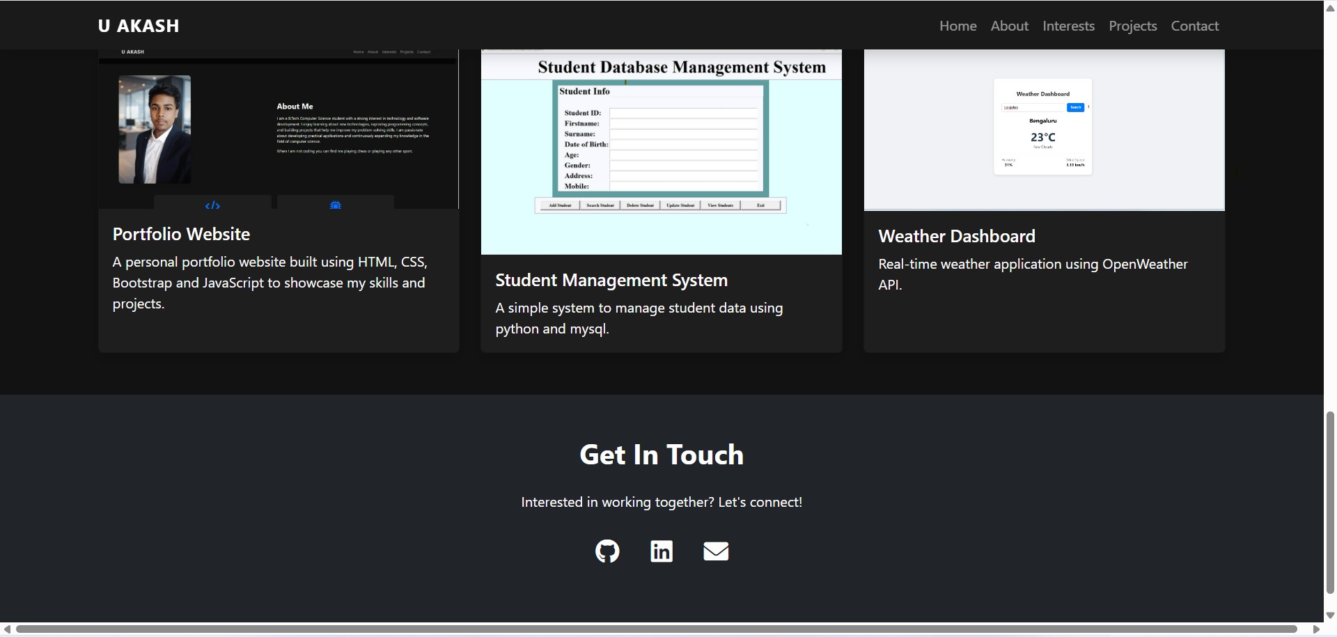 In this task I created a personal portfolio website to showcase my skills and projects. The website includes sections like Home, About Me, Interests, Projects and Contact. It was built using HTML, CSS and JavaScript.This task helped me understand how to design and organize a personal website to present my work.