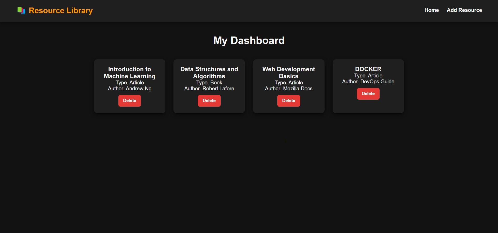 In this task I developed a simple web application using Node.js and the Express framework. The application allows users to register and log in and provides a dashboard to manage learning resources. Users can add resources by specifying the title, type and author and the added resources are displayed as cards on the dashboard with an option to delete them.
