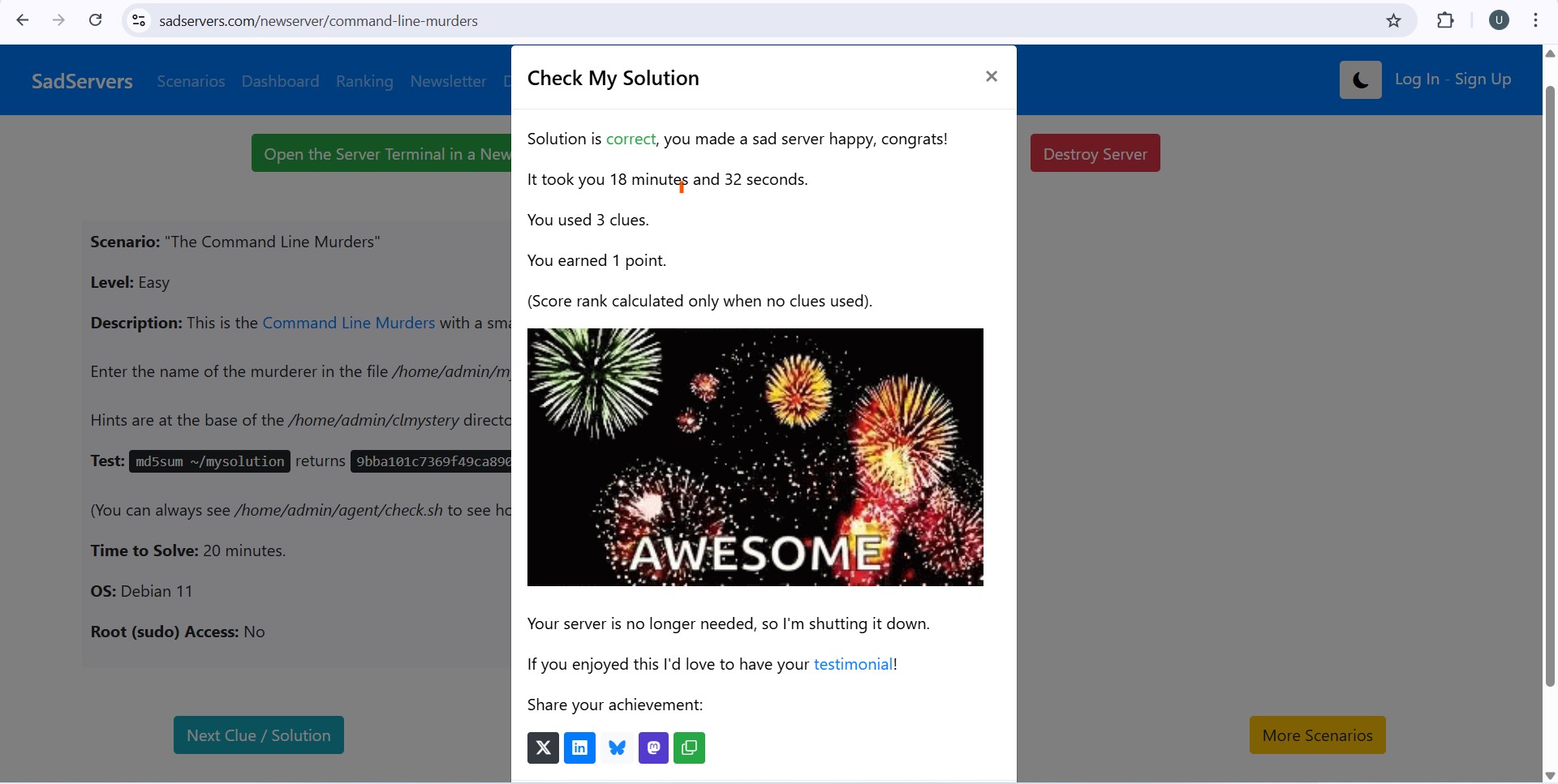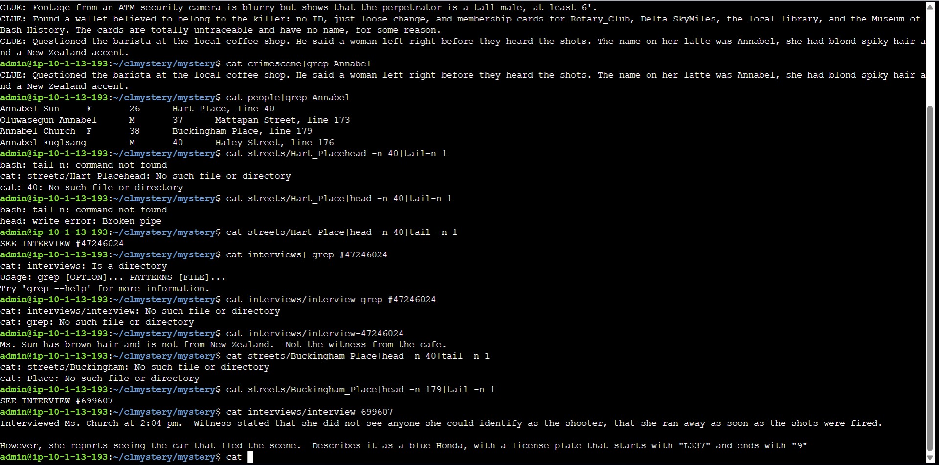 In this task I solved the "Command Line Murders" scenario on the Sad Servers platform. Using Linux commands such as ls, cd, cat, grep, head and tail
