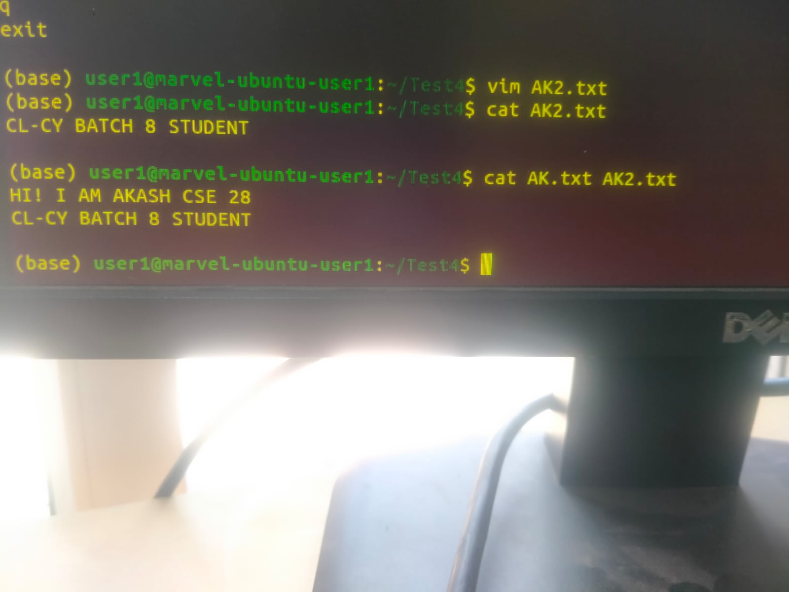 In this task I learned how to work with files using basic Linux terminal commands. I navigated to a directory using commands like cd and checked the files using ls. Then I created and edited text files (AK.txt and AK2.txt) using the vim editor and added some text to them. After saving the files I used the cat command to display their contents. I also used cat AK.txt AK2.txt to view the contents of both files together. This task helped me understand basic file creation, editing and viewing operations in the Linux terminal.