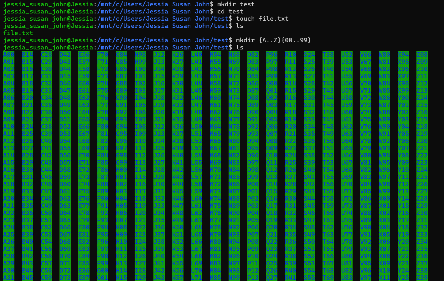 - To create 2,600 folders : mkdir {A..Z}{00..99}. This command tells to create a folder for every letter from A-Z paired with every number from 00-99