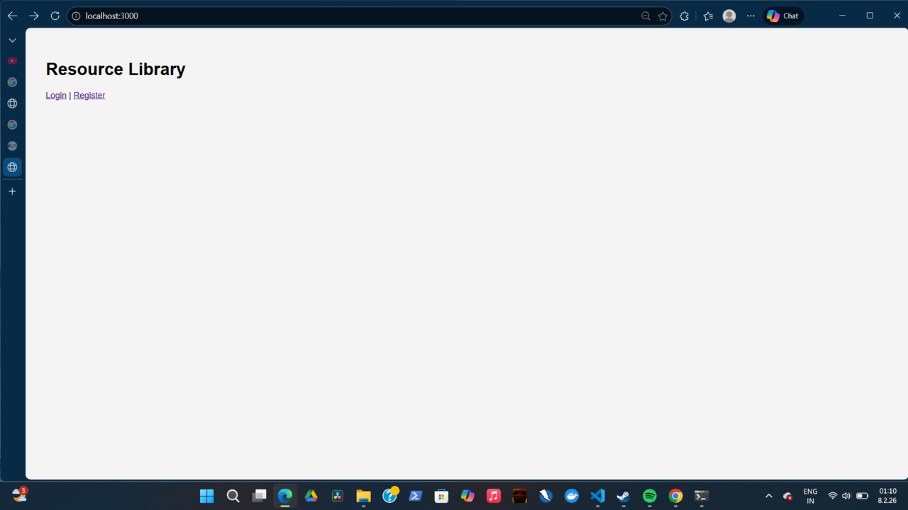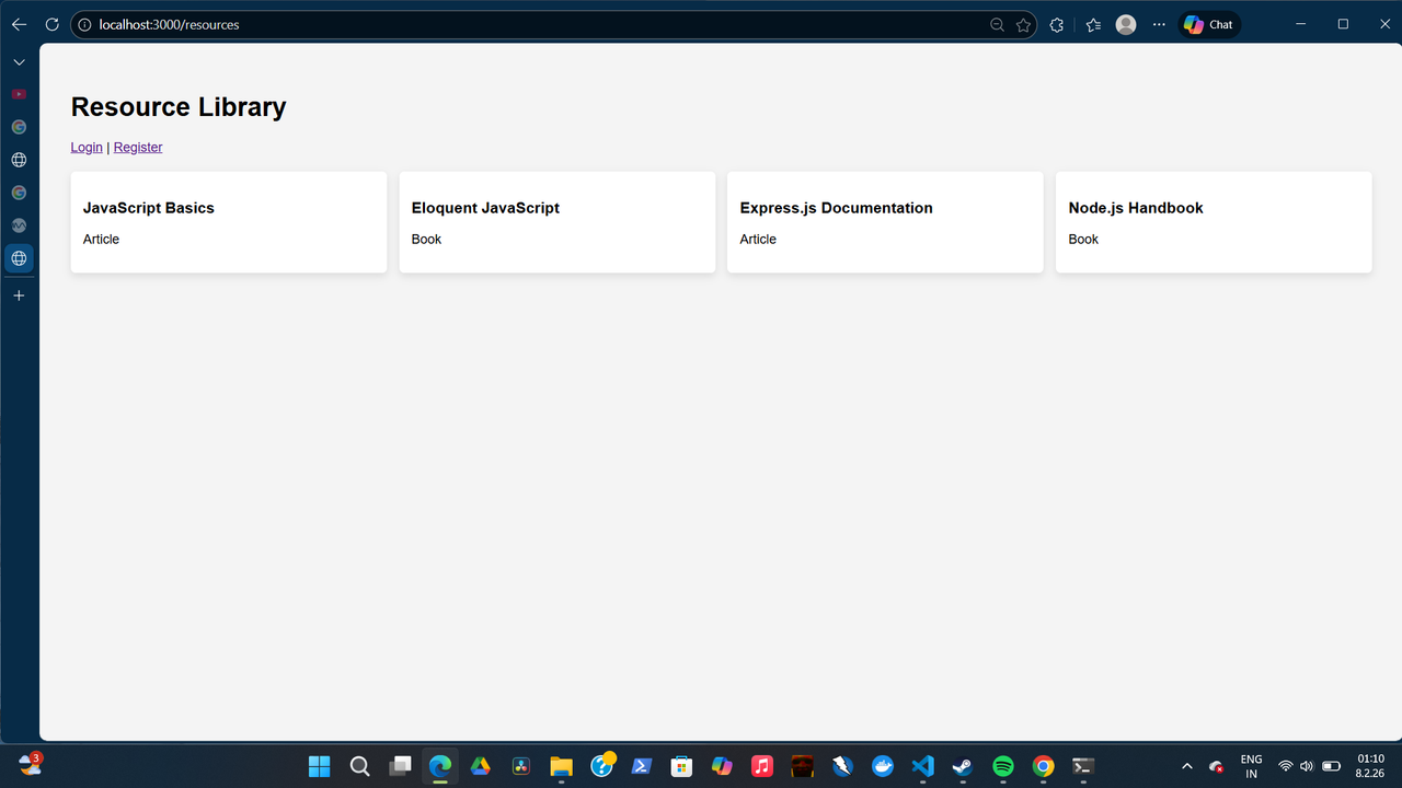 I built a Resource Library web app using Node.js, Express.js, HTML, CSS, and EJS. It allows users to browse educational articles and books, and includes a full user authentication system so they can register and log in to manage their accounts.