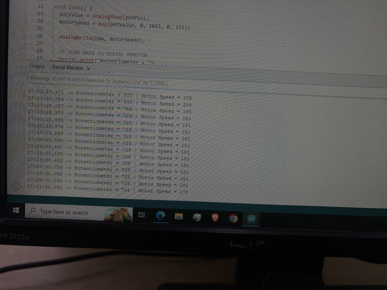 I controlled the speed of a DC motor using an Arduino UNO and an L298N motor driver. The Arduino generates a PWM signal sent to the L298N's ENA pin. Depending on the PWM, the driver switches the motor supply ON and OFF rapidly, varying the effective voltage and changing its speed.