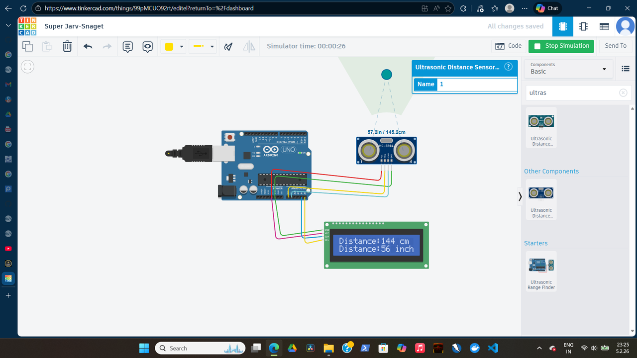 Tinkercad is a great platform for testing circuits virtually. Here, I focused on using an Ultrasonic Sensor with a servo motor and an Arduino UNO to create a simple radar-like object detection system. I learned how the sensor uses high-frequency sound wave reflection times to calculate distance.