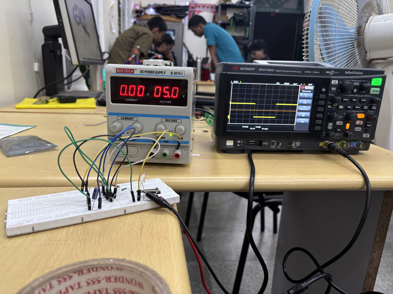 After powering the circuit, I observed the expected square wave output on the digital CRO screen.