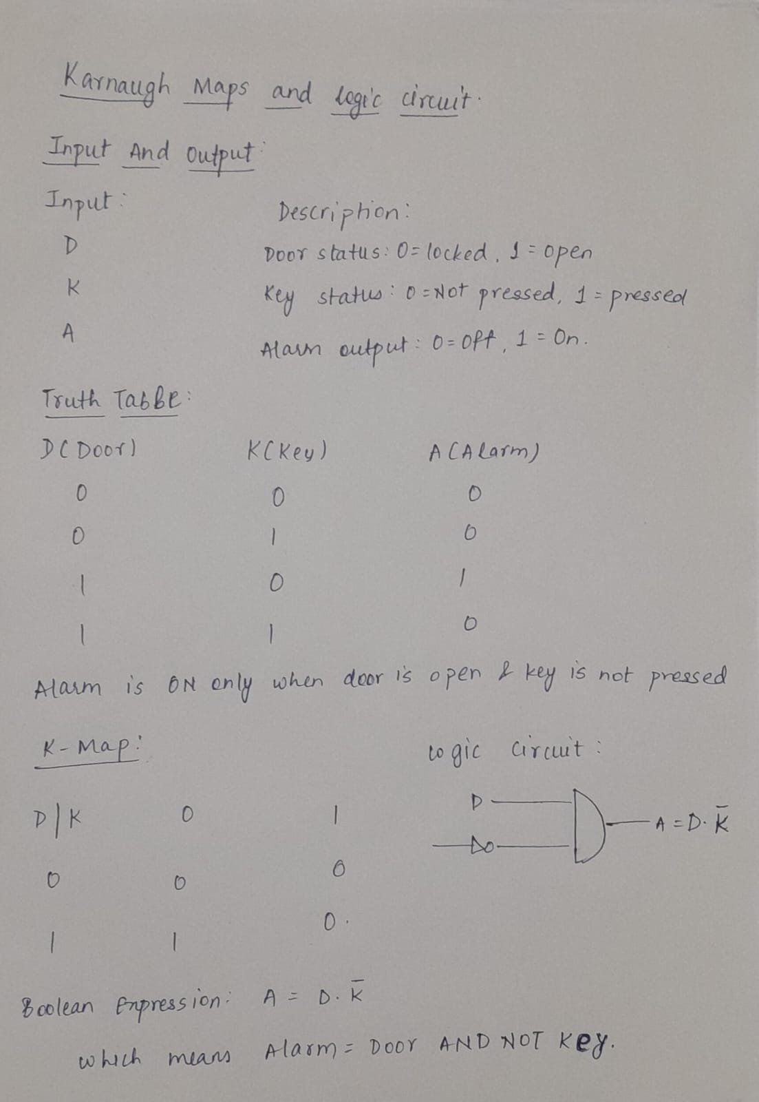 This task involved using karnaugh maps to design a burglar alarm. The alarm is triggered based on state of door and key.