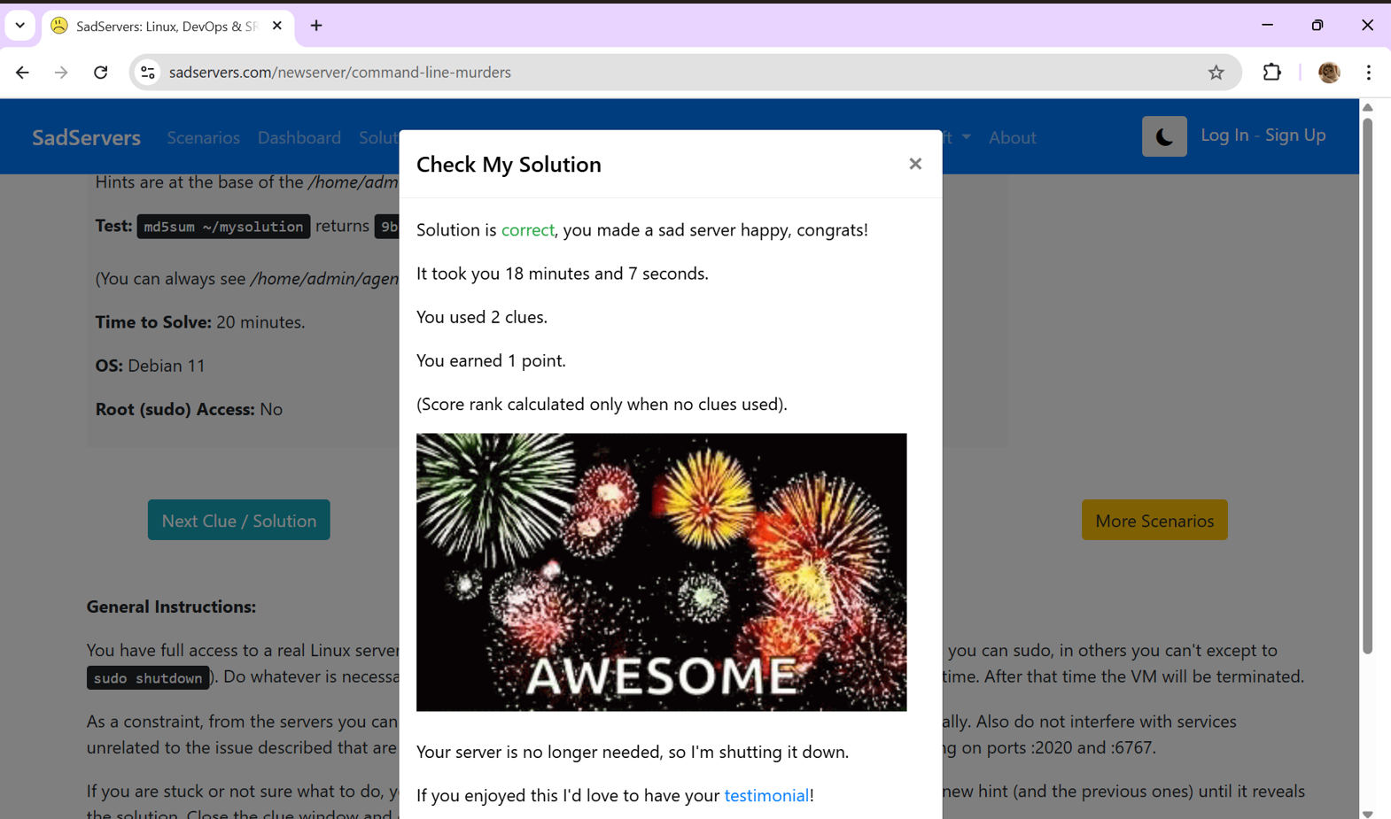 First, I Accessed the Sadservers platform and analyzed the problem by reading the description and system logs. I was given 8 hints to crack the problem and I was able to apply linux commands to investigate and fix the issues. Finally, I verified the solution by checking system responses and made the sad server happy.