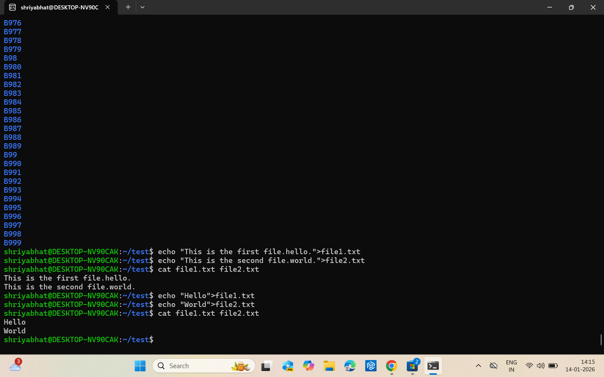 First, I created a folder and navigated into it. Then, I created a blank file and listed the files in the folder. I created multiple folders and concatenated 2 text files. All required file and directory operations mentioned were successfully executed using the terminal commands.