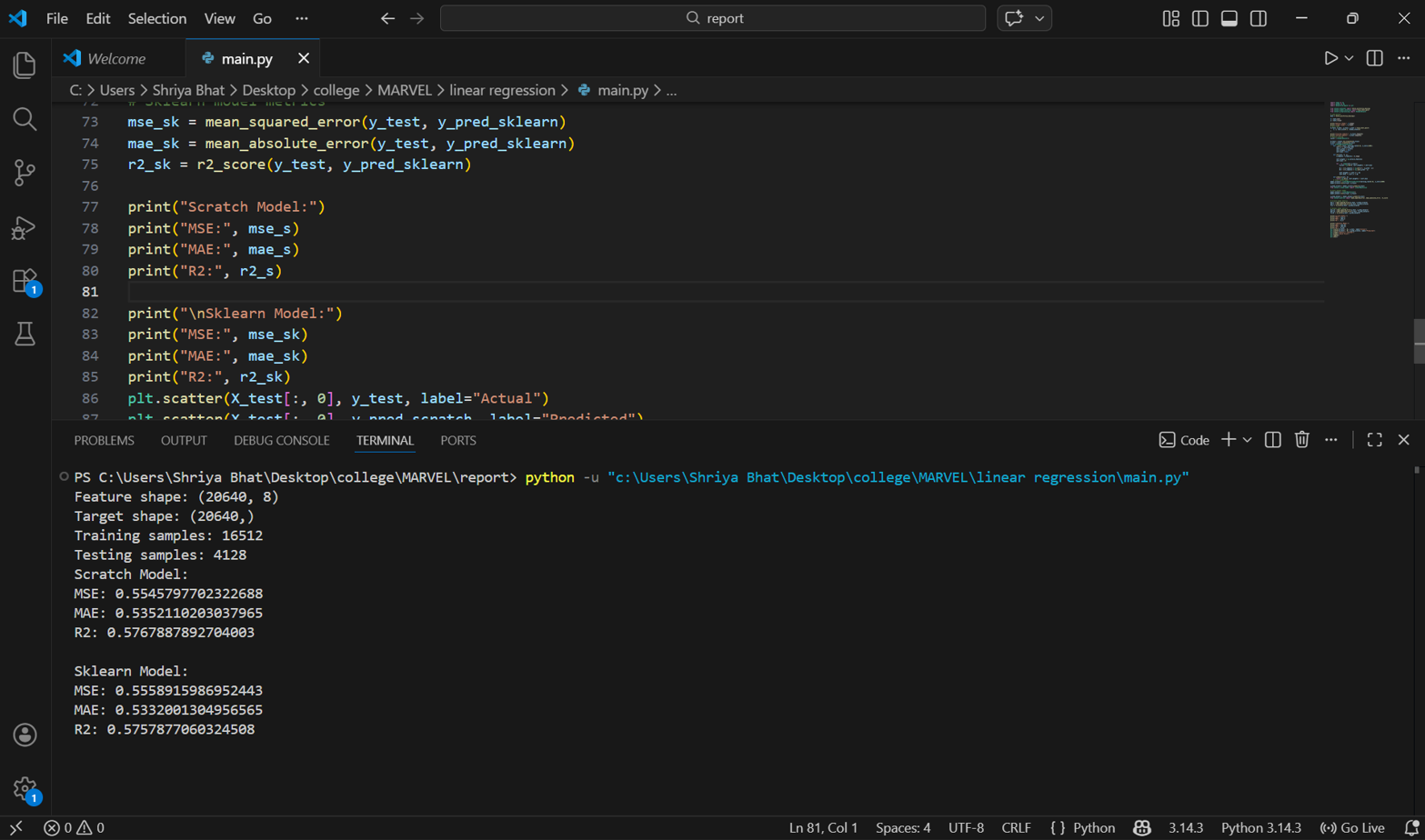 sklearn.linear_model.LinearRegression.I prepared the data and loaded the california housing dataset. I used "feature scaling" to normalize the data. Then I started linear regression from scratch which included initializing the weights and bias. I Updated the weights repeatedly to reduce the error in predictions. I also used "gradient descent" to minimize the error. The same dataset was trained using the built in linear regression model from scikit-learn for comparison. The performance metrics which I used are: