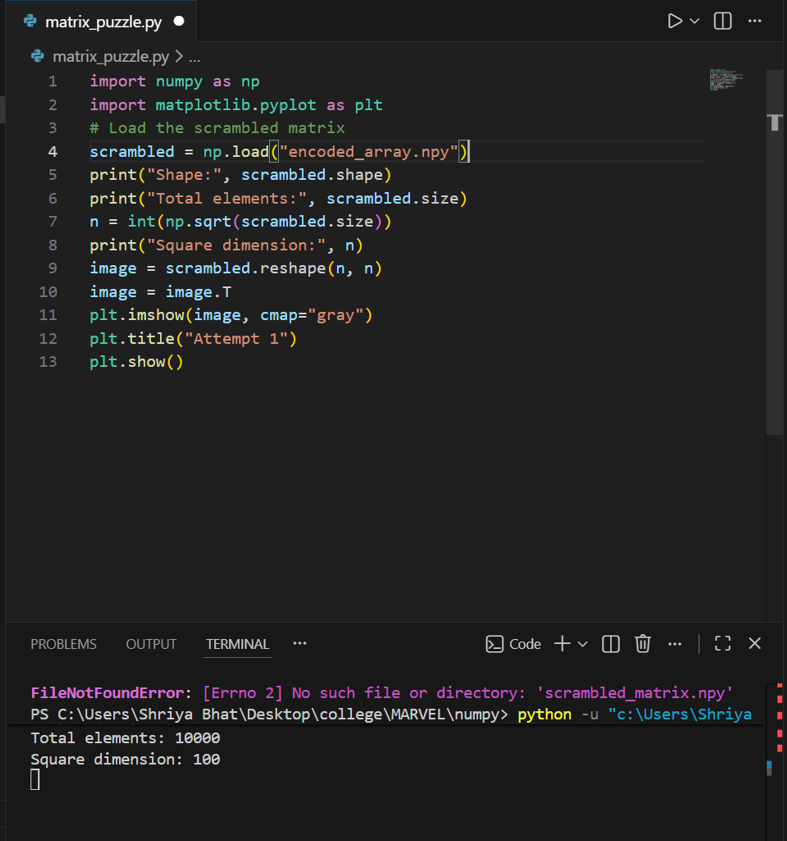 First I loaded the data. I downloaded the scrambled matrix file and loaded it into Python using NumPy. I was able to perform several NumPy operations to decode the matrix like reshaping the array into a square matrix and transposing it to the correct orientation or flipping rows or columns if required. These steps helped me arrange the data in the correct structure. After decoding, I displayed the matrix