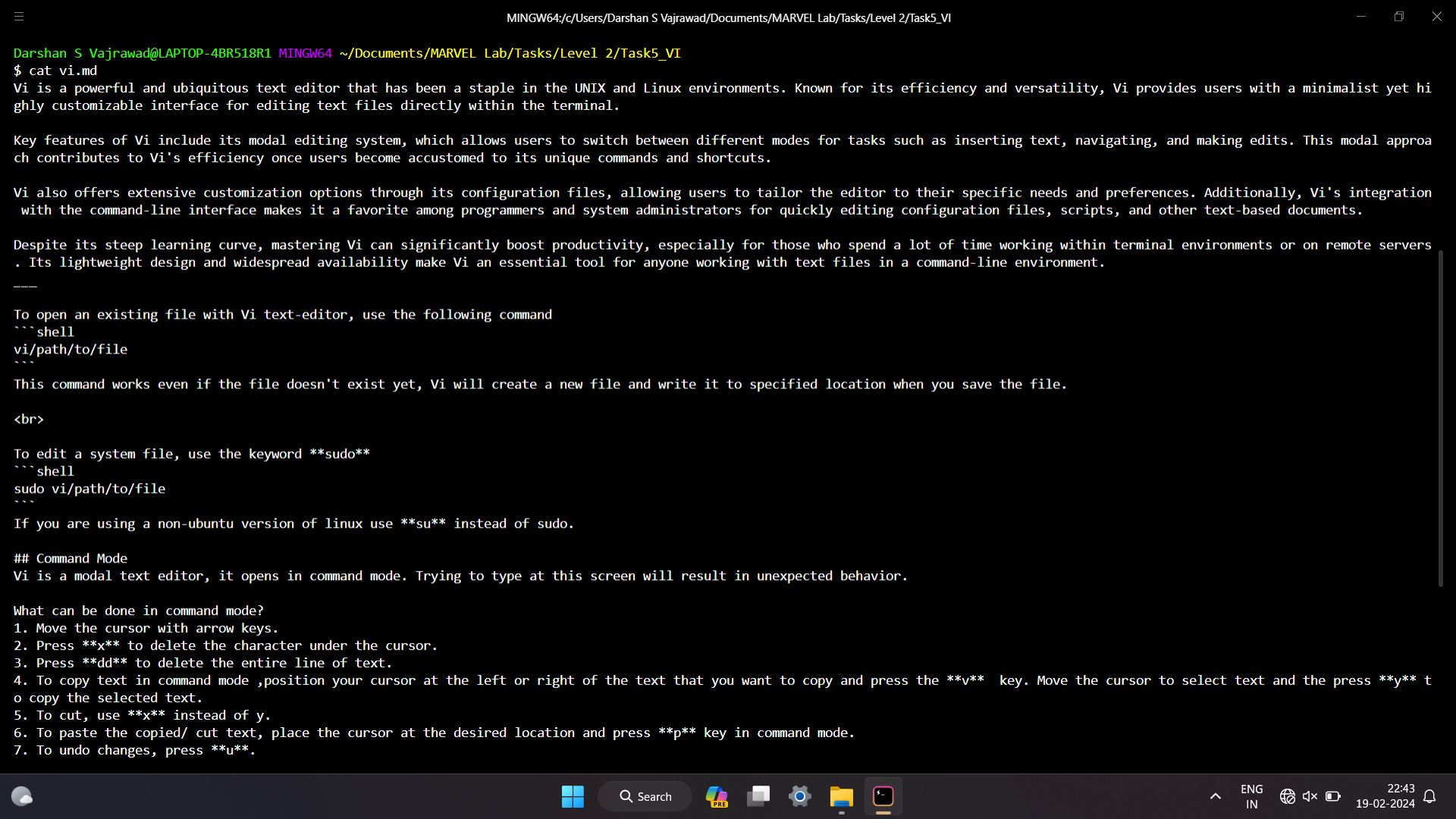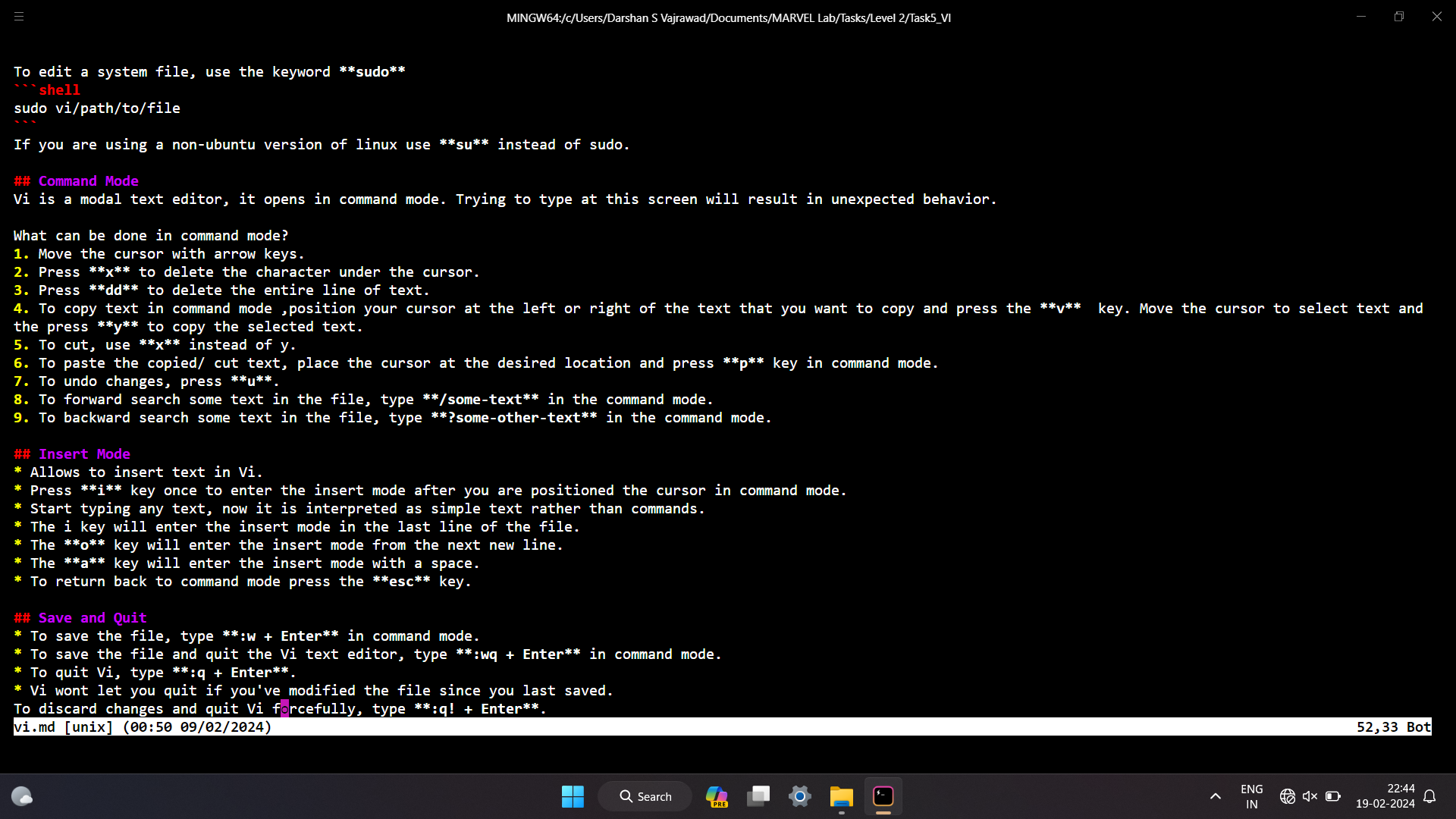 I learnt to edited text files in VI text-editor in Linux systems. I have edited a complete text file in VI, the images and link to the repo is given below.