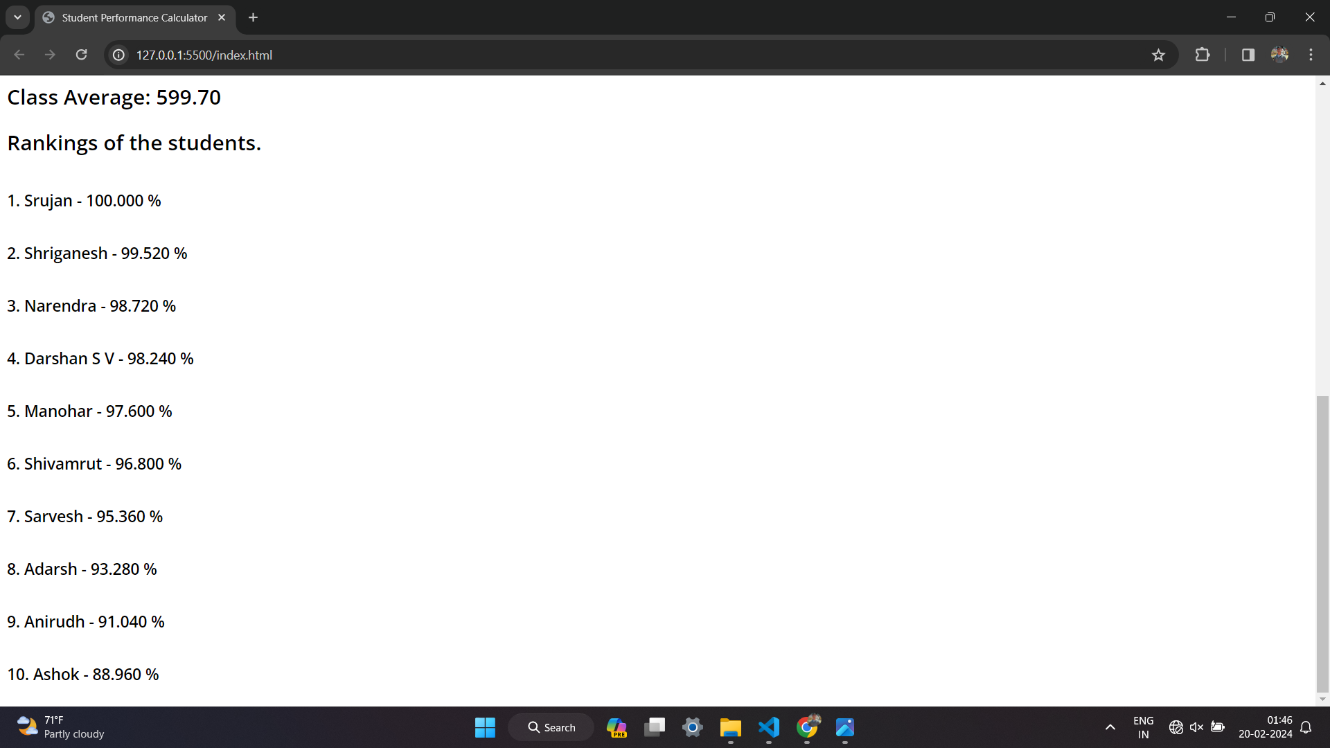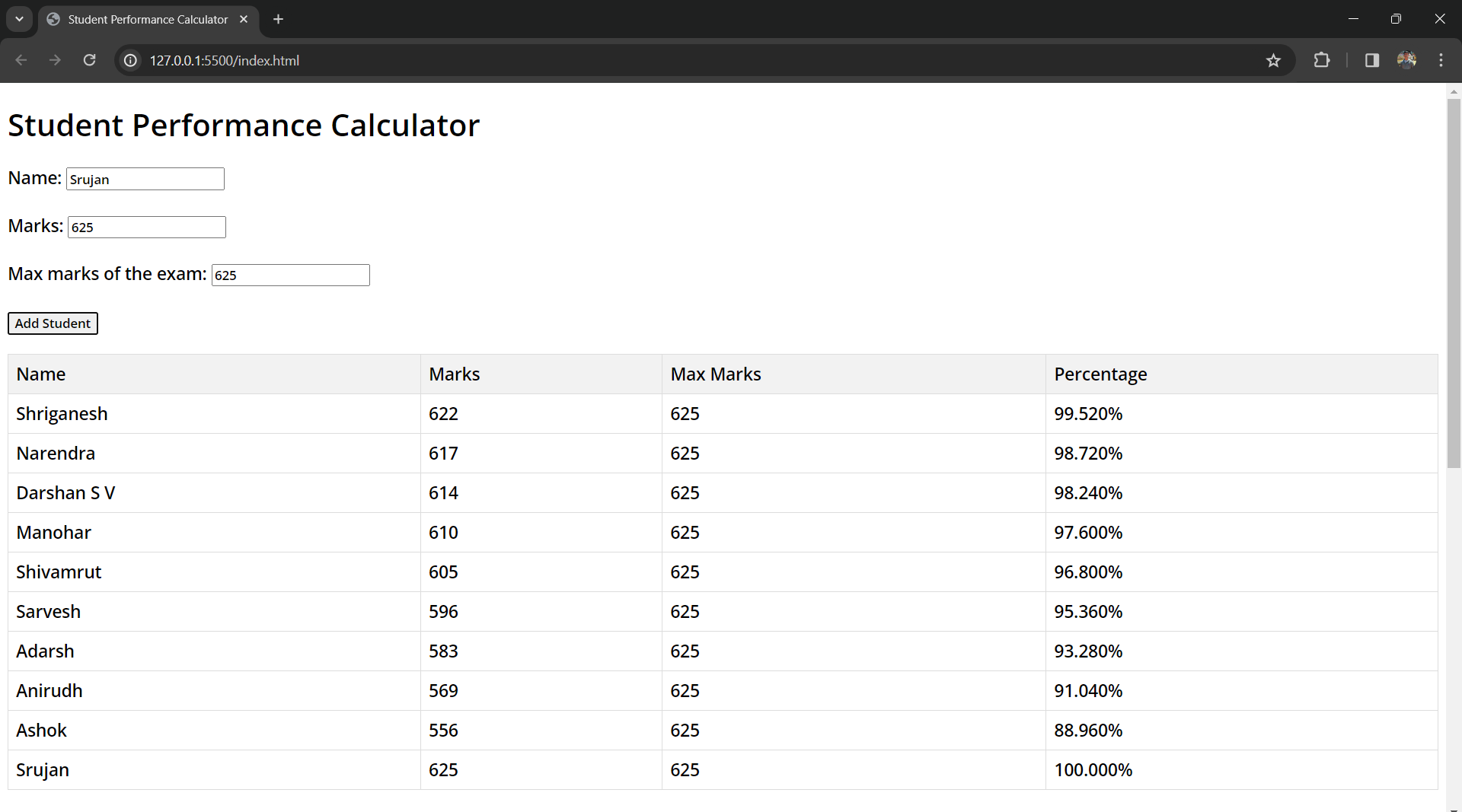 I have created this wonderfull static webpage, Student Performances Calculator using JavaScript. It take name, marks of students through a html form and calculate the following results: