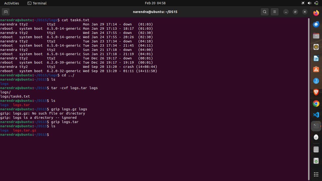 - Pipe this information into a text file and put it into a folder named logs. Zip this folder using gzip and tar.