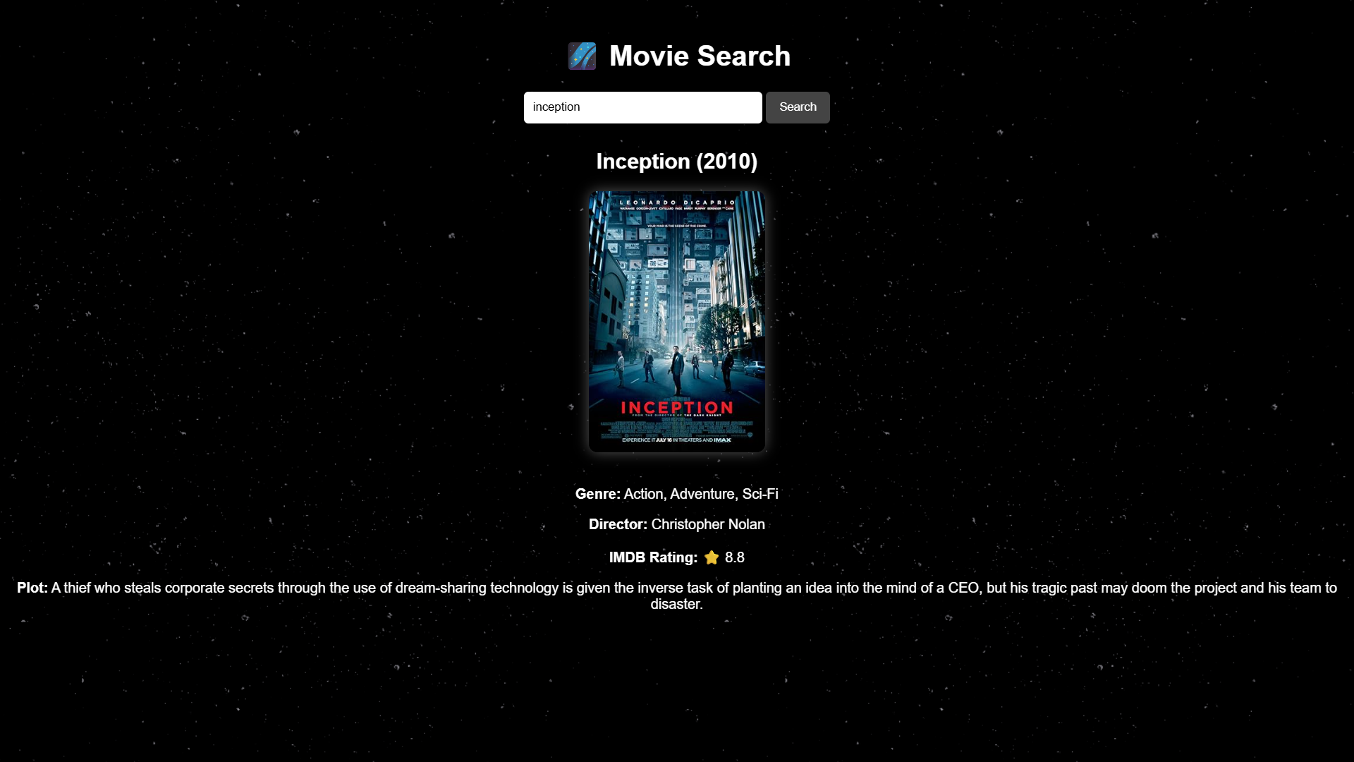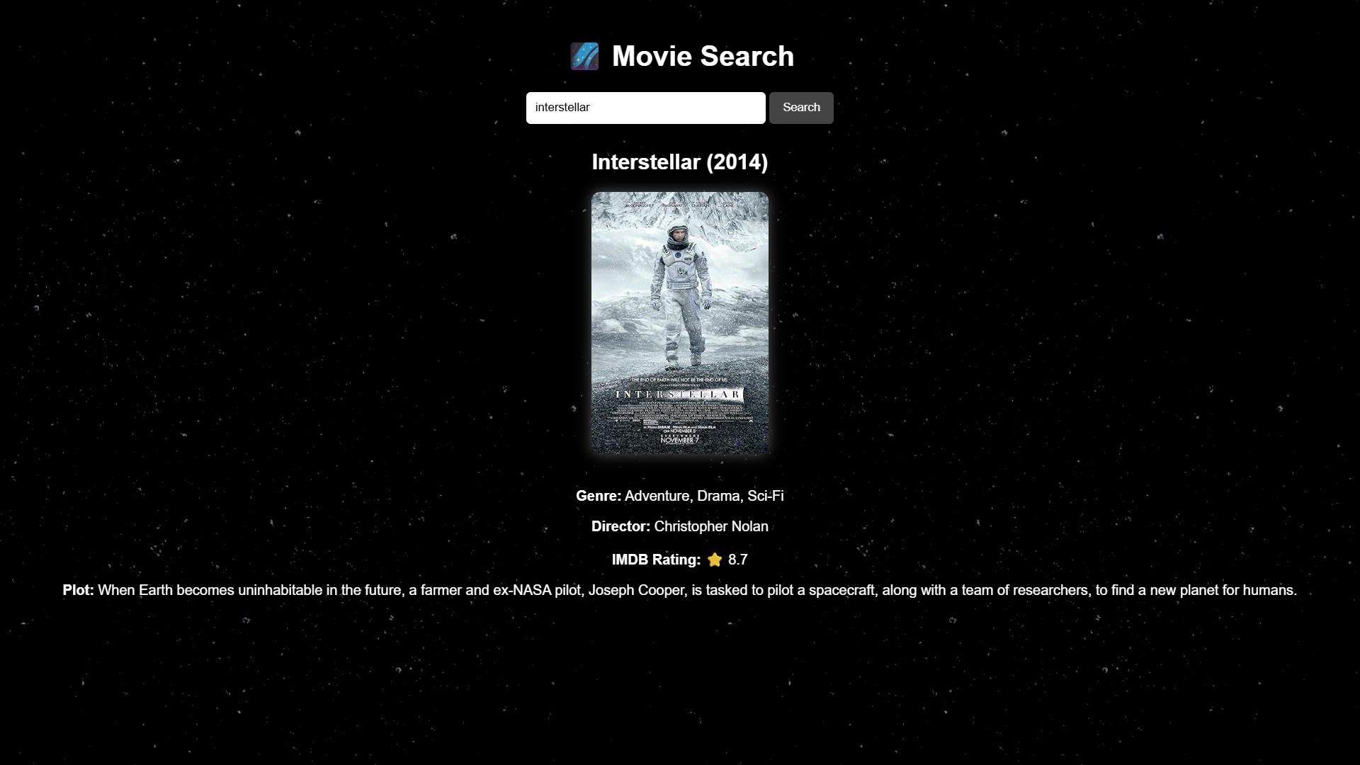 The application can fetch details for movies such as Interstellar and Inception. The API returns information including the poster, genre, director, IMDb rating, and a short description.
