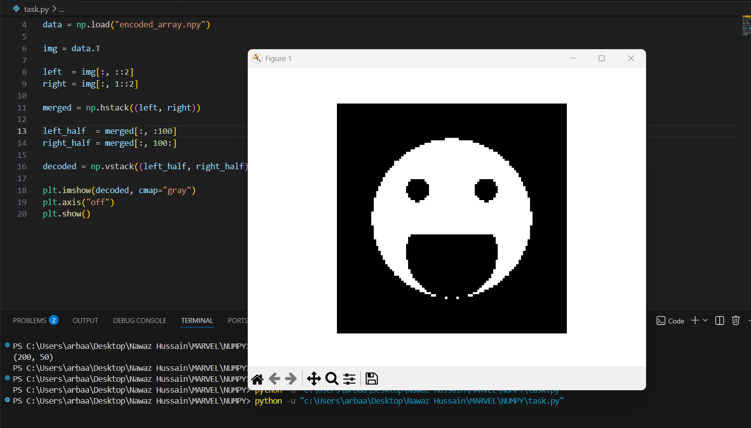 In this task, a scrambled matrix was downloaded and analyzed using NumPy. The matrix was reshaped and manipulated using operations such as reshaping, flipping, and transposing. After correcting the orientation of the matrix, the hidden image was revealed using Matplotlib.