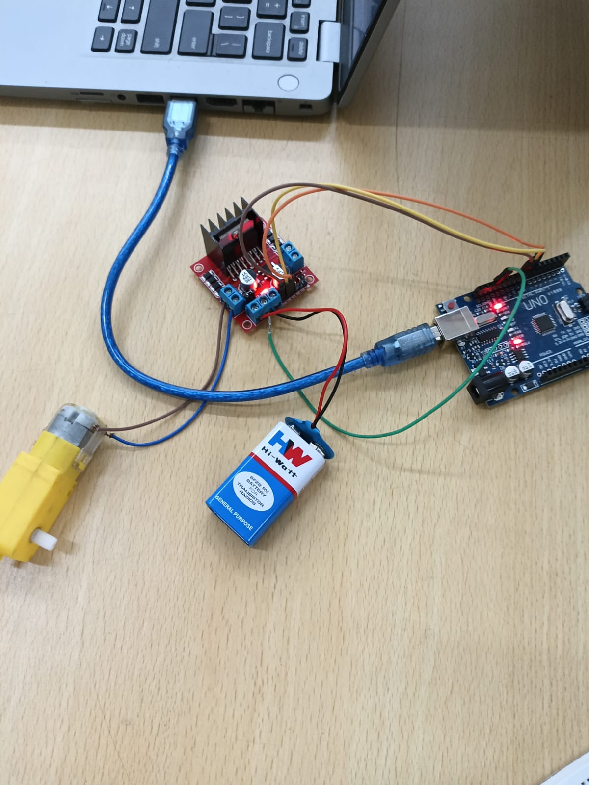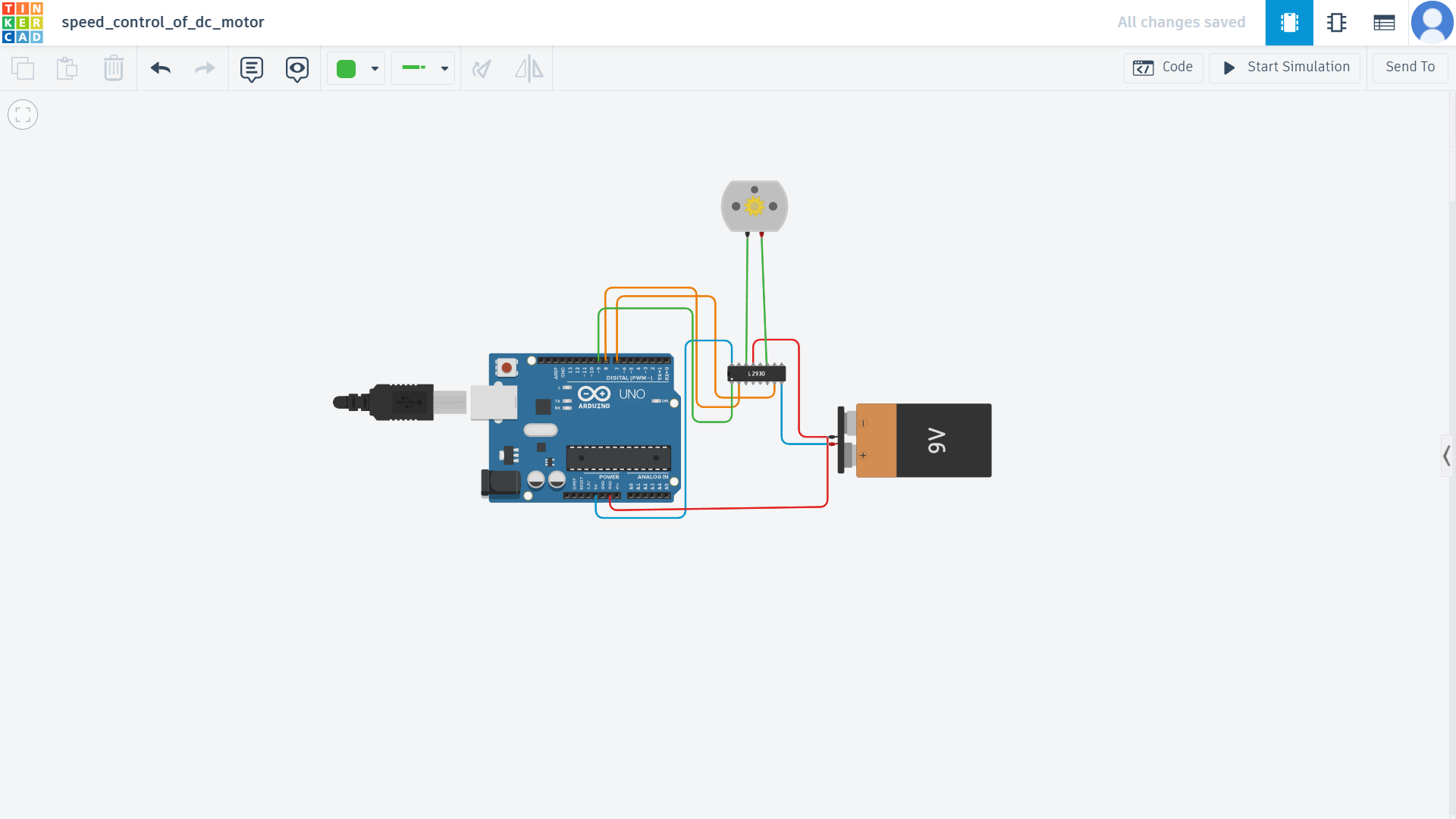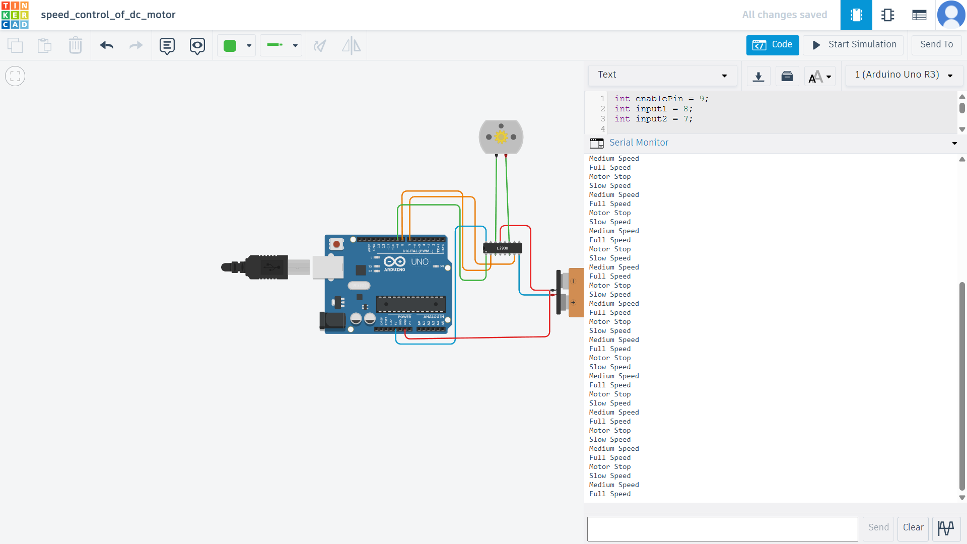 The circuit was first simulated using Tinkercad, and then the hardware setup was tested with an actual motor driver and DC motor.
