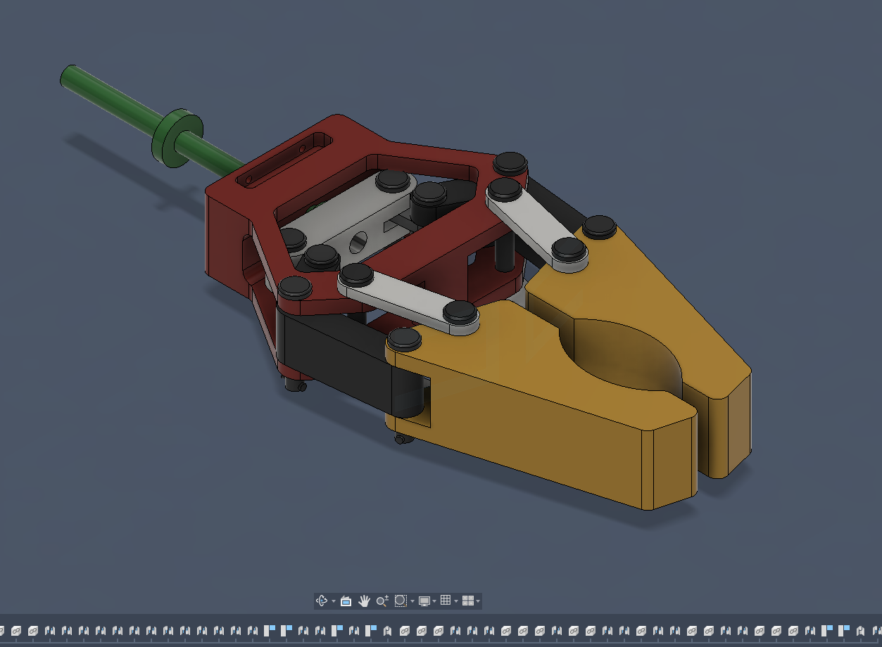 This mechanical gripper design utilizes a direct-drive linear sliding mechanism to actuate a symmetrical jaw system. Unlike traditional rotary lead-screw designs, the central green shaft is constrained to a linear sliding motion, acting as a plunger that drives the interconnected linkage assembly.
