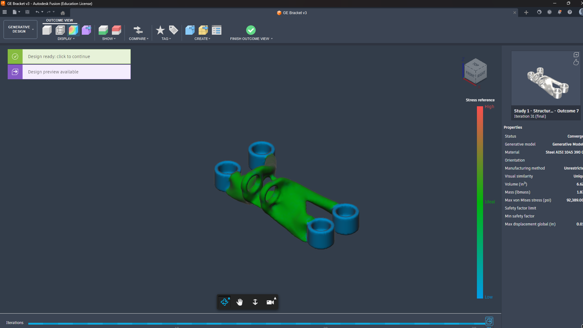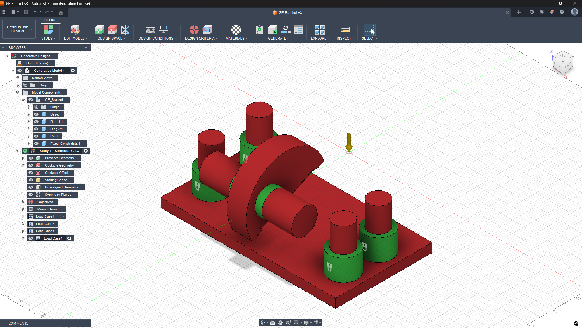 I imported the GE Bracket sample into Fusion 360’s Generative Design to see how it can optimize the bracket shape. First, I selected the important areas like the bolt holes and the pin region as Preserves, so Fusion wouldn’t modify them. Then I added Obstacles so the design won’t grow into spaces where bolts or other parts need clearance. After that, I applied the actual loads and constraints the bracket will experience in real use.